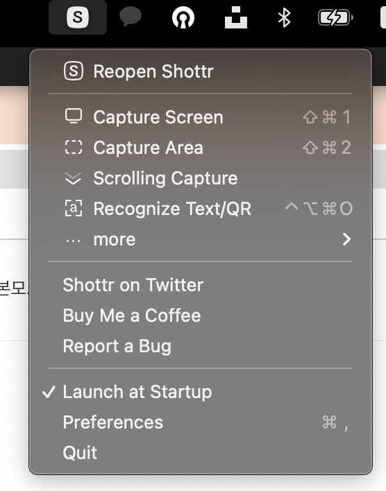 설치를 하게 되면 상단 탭에 S 모양이 생기는데 이게 그 앱이다. 스크립 전체 캡처, 부분 캡처 등 다양한 형태로 캡처 기능을 제공한다.