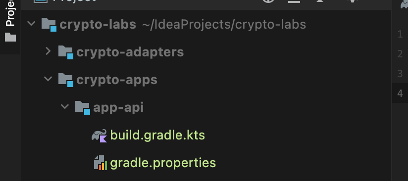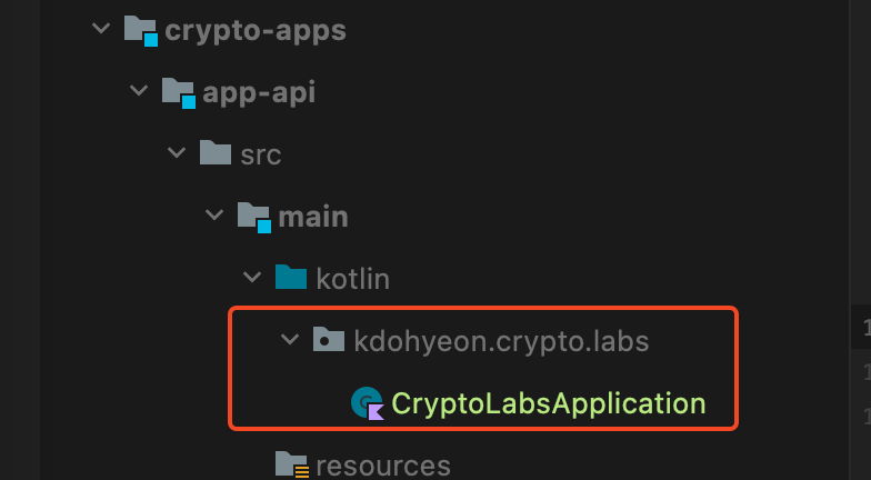 디렉토리 4개를 모두 만들면 아래와 같은 구조가 완성된다. 그리고 바로 스프링 어플리케이션 클래스를 만들기 전에 패키지 구조도 만들어준다. "kdohyeon.crypto.labs" 와 같이 설정해줄 수 있다. 주의할 점은 패키지와 디렉토리는 달라서 꼭 패키지로 만들어주어야 한다.