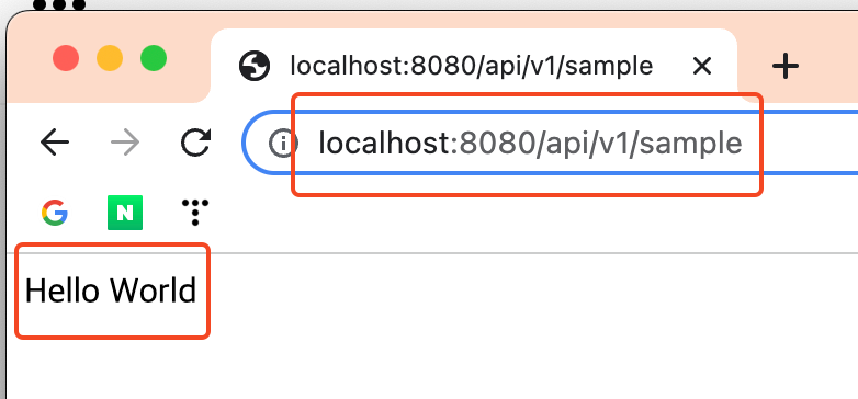 실행을 해두고 브라우저에서 만들어둔 API 주소를 입력해보면 "Hello World" 가 노출된다.