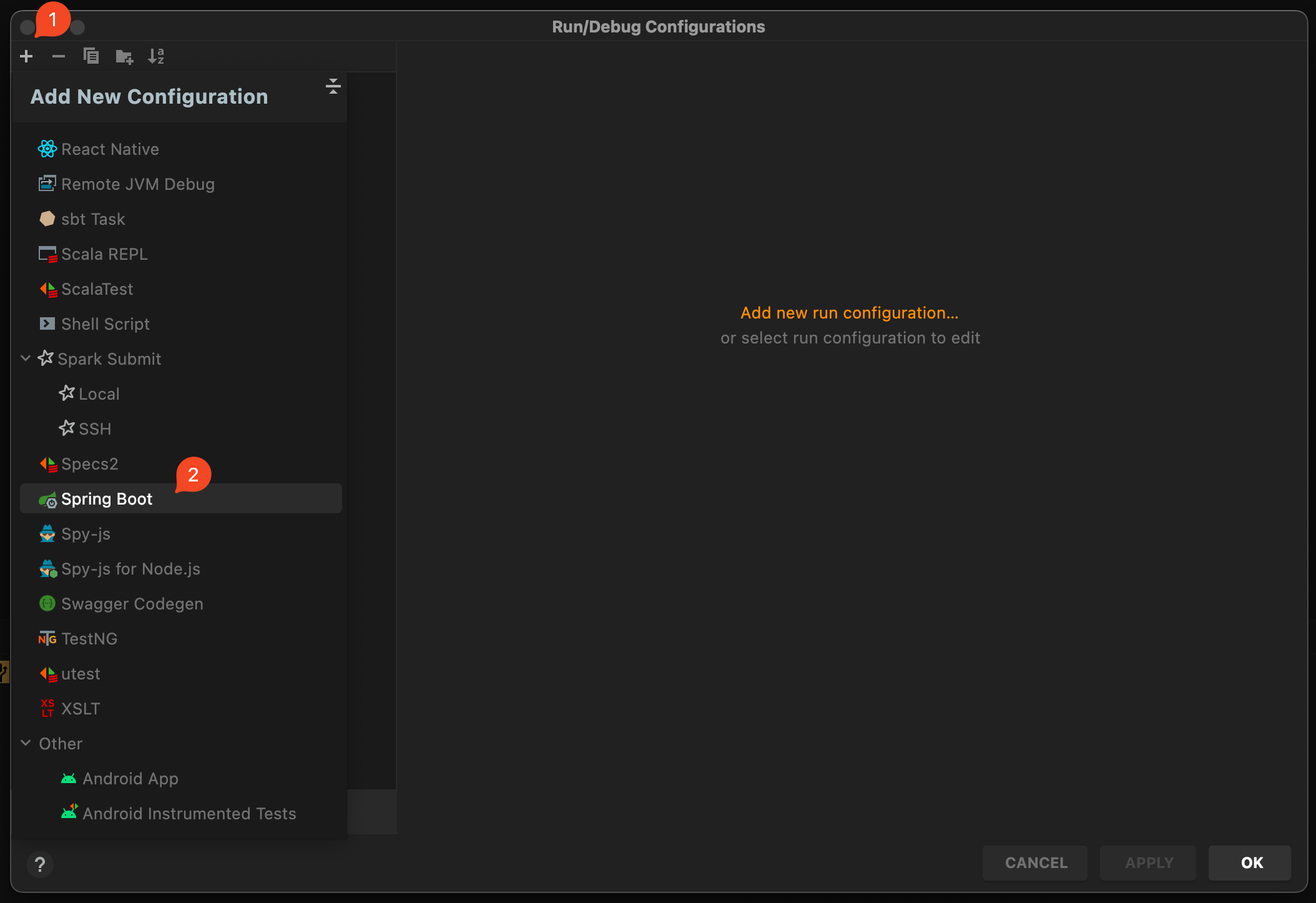 ADD CONFIGURATION... 을 클릭하면 아래와 같은 화면이 나오는데 순서대로 클릭해서 "Spring Boot" 까지 클릭한다. Name 과 Builds and run 부분에 값을 채워넣는다.