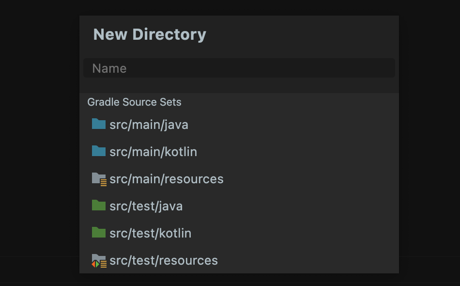 소스 코드를 추가하기 위해 먼저 작업할 디렉토리를 만들어야 한다. 만들어야 하는 디렉토리로는 src/main/kotlin, src/main/resources, src/test/kotlin, src/test/resources 를 만든다. (지금까지 설정이 제대로 되었다면 IDE 가 새로 만들 디렉토리를 추천해준다.)