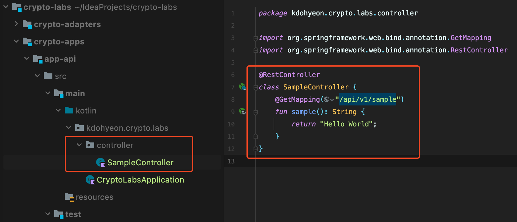 이제 점점 기본 틀을 만들어 가고 있으니 Hello World 를 출력하는 API 를 만들어보자.
