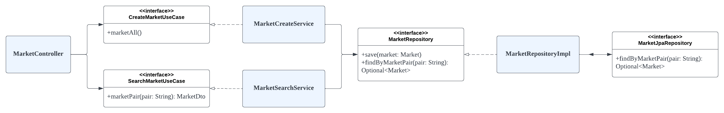 CreateMarketUseCase 는 마켓 데이터 생성을 위한 유즈케이스를 정의한다. CreateMarketUseCase 를 구현하는 구현체이다. Upbit에서 거래 가능한 마켓 정보를 조회하는 OPEN API를 호출하여 데이터를 받아온 다음 MarketRepository를 통해 데이터를 저장한다.