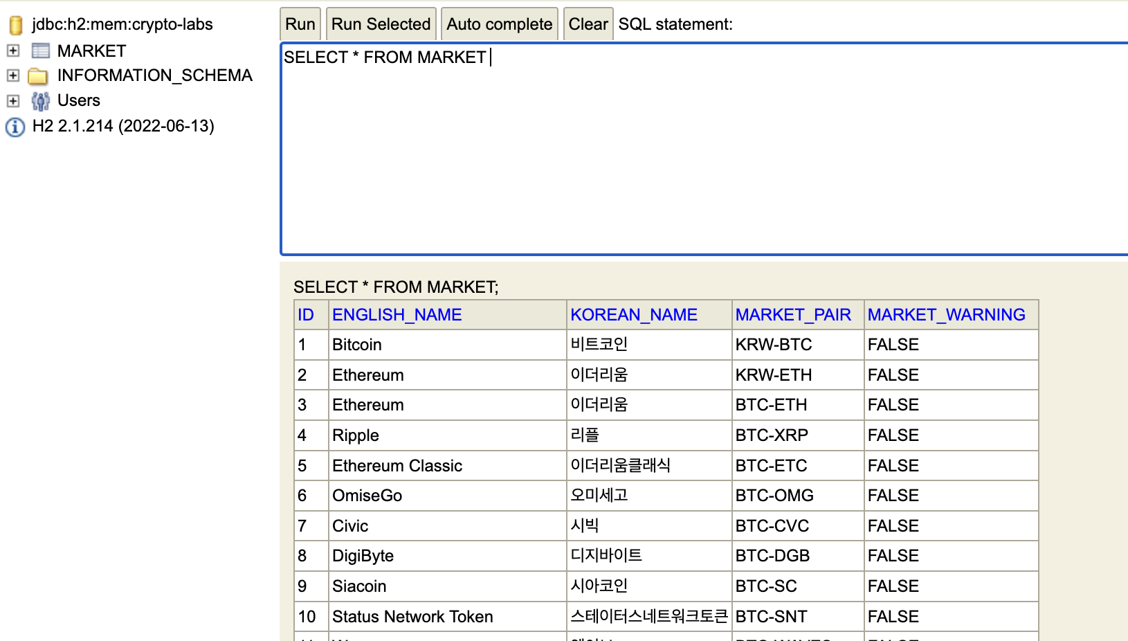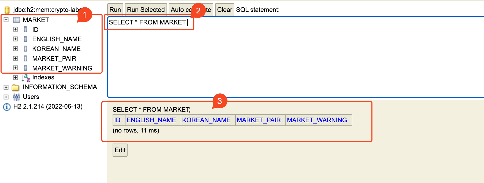 1) h2-console 로 접근을 하면 MARKET 이라는 테이블이 이미 생성되어 있는 것을 확인할 수 있다. 컬럼도 엔티티에서 정의한대로 잘 생성되어 있다. 2) SELECT문을 활용하여 데이터를 조회해보면 바로 아래에 해당 조회에 대한 결과가 노출된다. 3) 아직 데이터를 넣지 않았기 때문에 아무런 데이터가 없다.