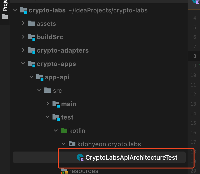 아키텍쳐 검사도 테스트의 일부분이기 때문에 test 디렉토리에 생성했고, app-api 에 대한 테스트이기 때문에 crypto-apps/app-api 모듈 내 위치시켰다.
