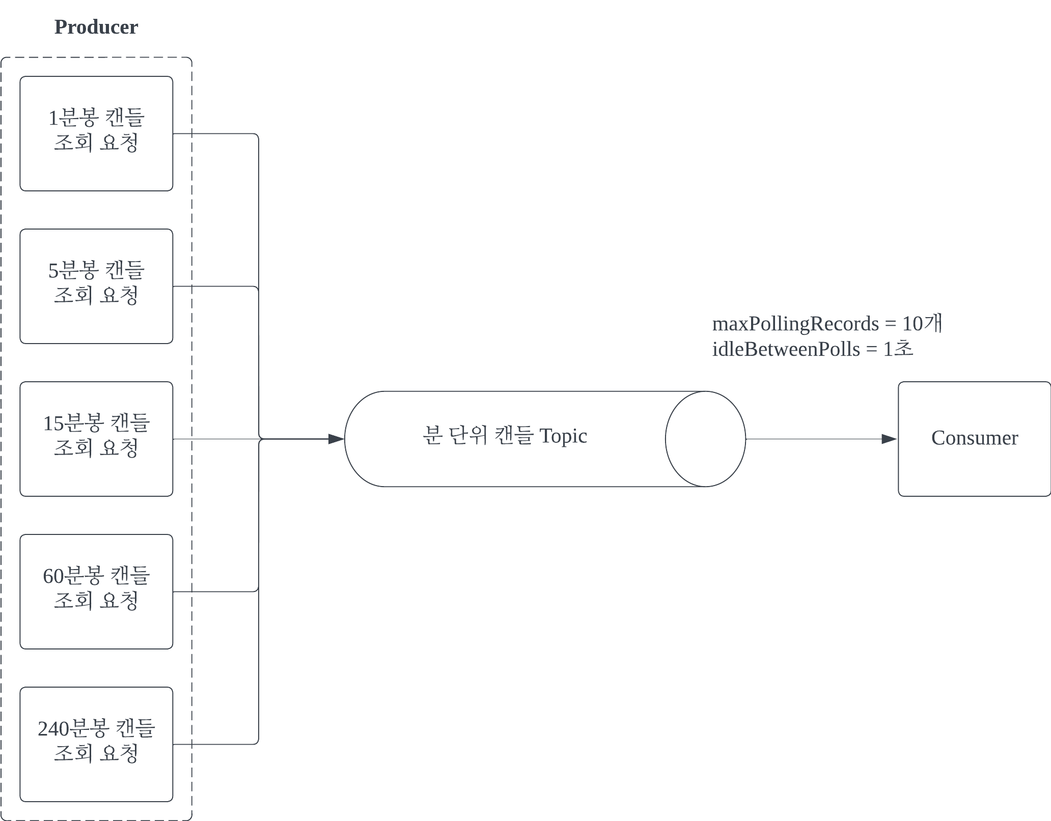 다만 신규 분 단위의 캔들이 지속적으로 추가되는 경우에는 produce 속도가 consume 속도를 넘어설 수 있기 때문에 메시지 렉이 쌓이지 않도록 추가 작업이 필요하다. 예를 들어, 초당 10회 요청 제한은 각 IP 주소를 기준으로 하기 때문에 새로운 서버를 둘 수도 있다. 또는 분 단위 데이터는 한번의 API 요청에 최대 200개까지 조회할 수 있기 때문에 API 요청 빈도를 늦추고 조회하는 캔들 개수를 늘려서 처리할 수도 있다. 지금 당장은 1분에 최대 590번의 캔들 조회만 발생하기 때문에 (= 600번 이내) 별도의 처리는 할 필요가 없다.
