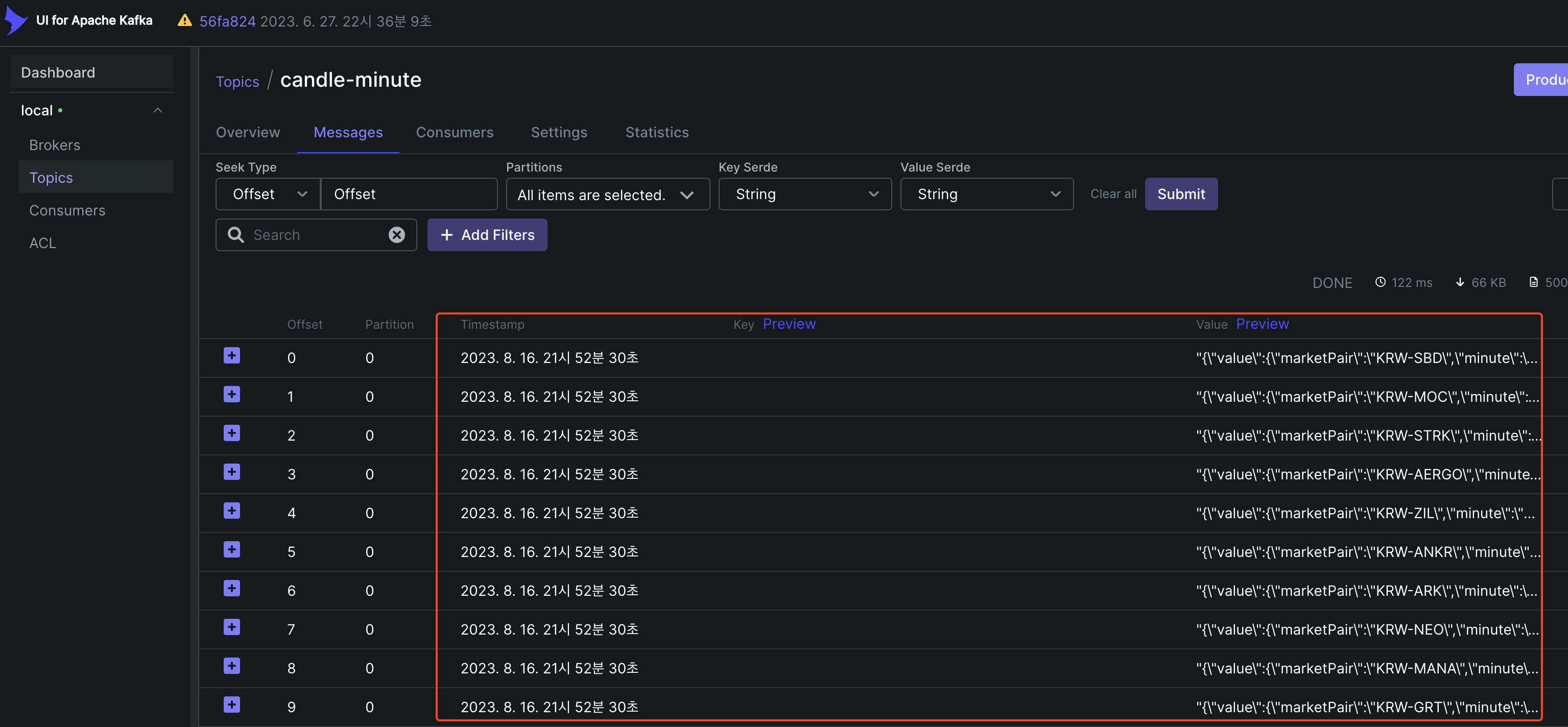 토픽의 보관 기간의 기본값은 7일로 설정되어 있다. 따라서 별도의 설정을 하지 않으면 7일간 메시지가 보관된다. 하지만 분 단위 캔들 데이터를 조회하는 경우에는 1분 이내로 모든 메시지들이 컨슘되기 때문에 7일간 메시지를 보관할 필요가 없다. 적당히 1시간으로 설정해두었다.