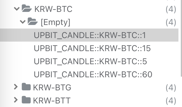 위와 같이 API 를 통해 가져온 데이터는 레디스에 저장하도록 구성했다. 아래 그림은 비트코인 (BTC) 에 대해 1분, 5분, 15분, 60분 데이터가 쌓여있는 모습이다.
