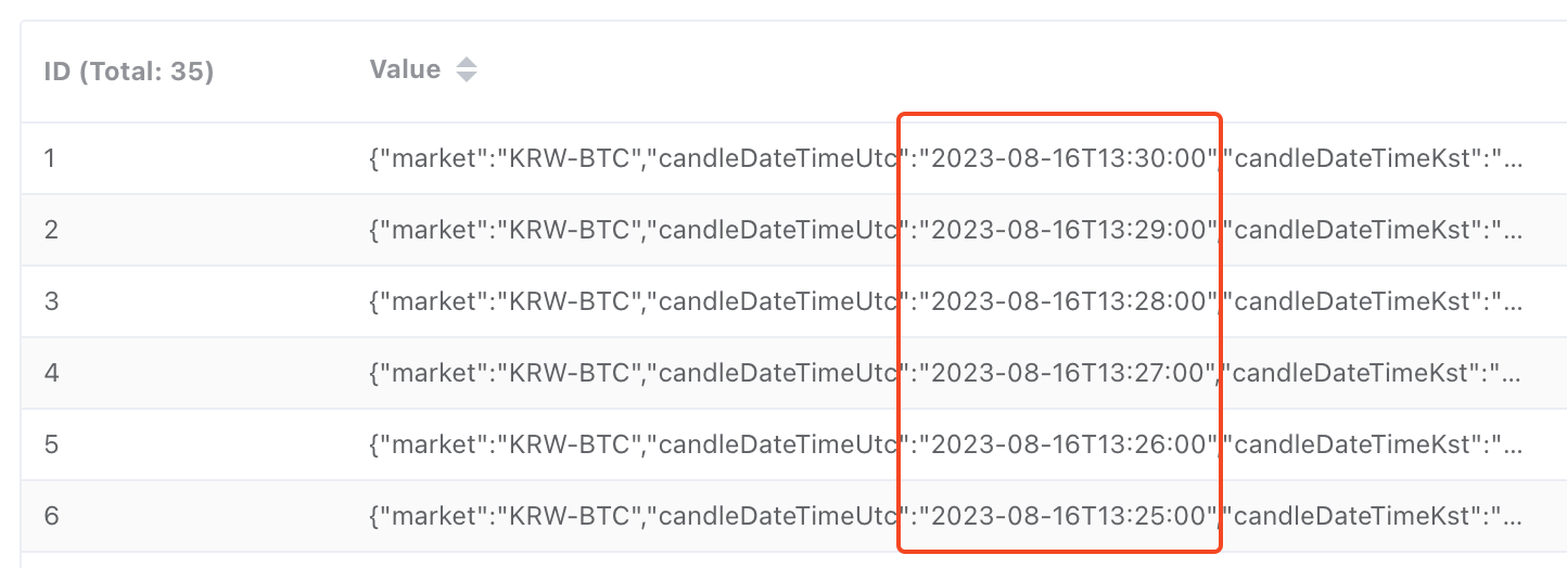 1분 데이터를 보면 정상적으로 잘 쌓이는 것을 확인할 수 있다.