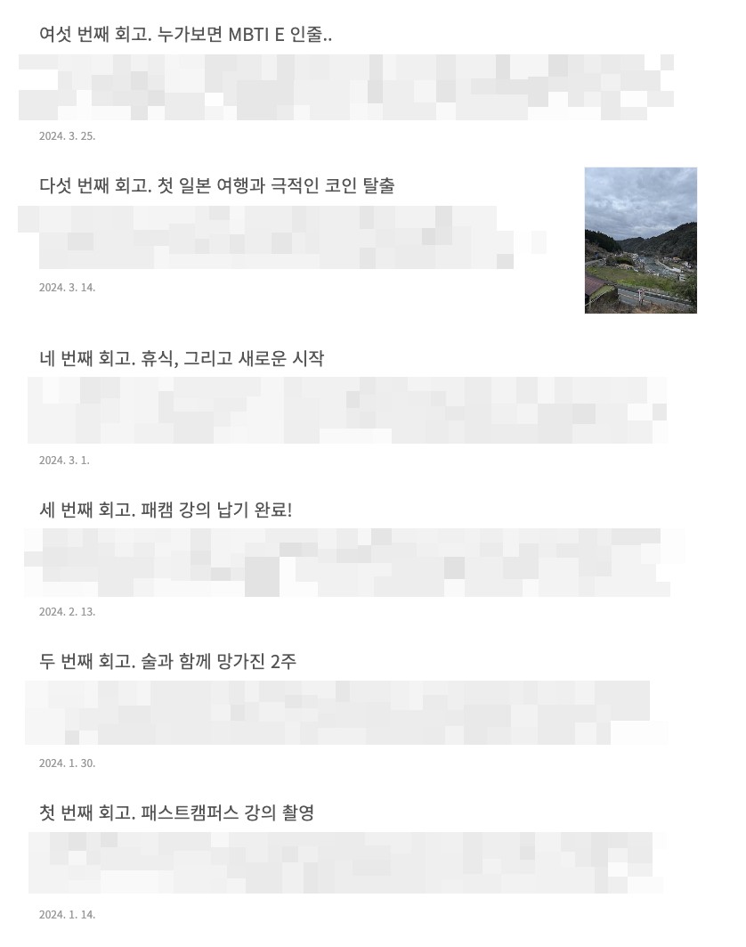 이제 1분기가 지났고, 3달 = 12주이기 때문에 현재까지 총 6번의 회고를 진행했다. 세부 내용은 부끄러워서 공개를 하기 어렵지만 제목만 간단히 공유해본다.