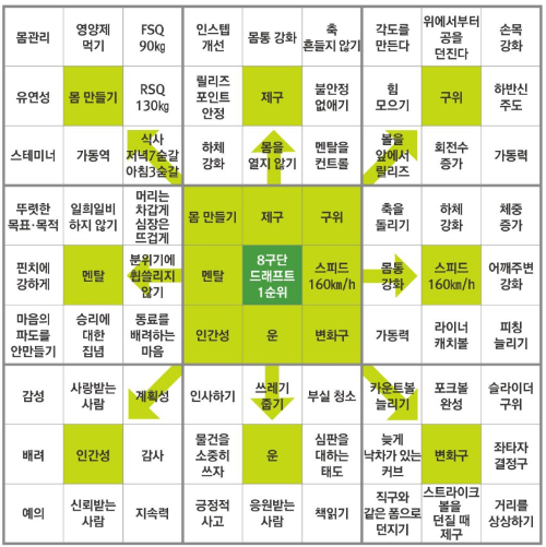 만다라트 계획표는 하나의 큰 목표를 이루기 위해 필요한 세부 목표를 정하고, 그 세부 목표를 이루기 위해 더 작은 단위의 행동이 적혀있다.아래는 오타니가 작성해둔 계획표인데, 최종 목표로는 8구단 트래프트 1순위 이고, 이를 이루기 위해서는 몸 만들기, 제구, 구위 등의 세부 목표가 있다. 또, 몸 만들기를 이루기 위해서는 몸관리, 영양제 먹기, 유연성 등의 더 작은 목표와 행동이 적혀있다.