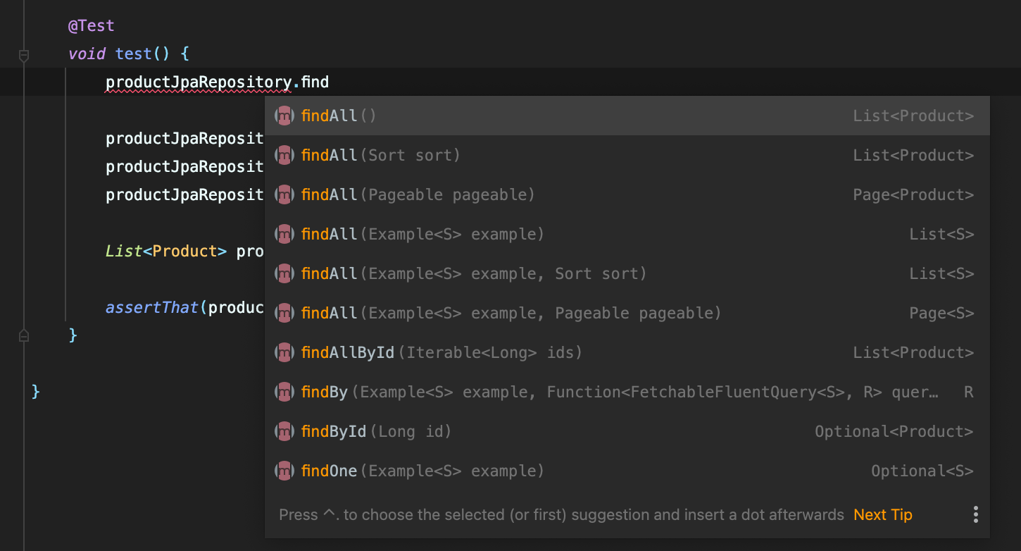 여기까지 하면 준비 완료이다. 상당히 간단하다. 해당 인터페이스를 빈으로 주입받고, 지원되는 메소드가 어떤 것들이 있는지 확인해보자. 조회는 findAll(), findAllById(), findById() 등 기본적인 쿼리를 지원하고, save(), delete() 등 쿼리도 지원한다.