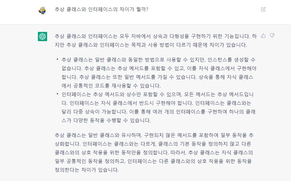 ChatGPT 가 말하는 추상 클래스와 인터페이스의 차이