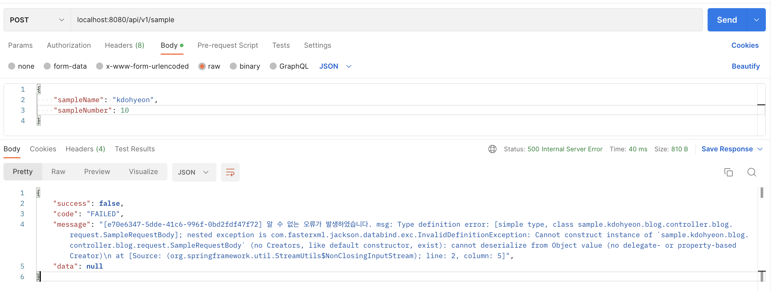 SampleRequestBody 에는 2개의 필드가 포함되어 있고 @Getter 어노테이션만 부여되어 있다. POST 형식으로 API 를 호출할 수 있고, @RequestBody 로 맵핑해두었다. POSTMAN 등 API 를 호출할 수 있는 툴을 사용하여 /api/v1/sample API 를 호출하면 다음과 같이 에러가 발생한다.