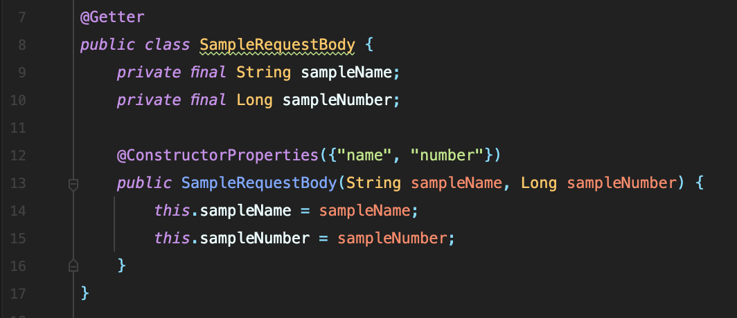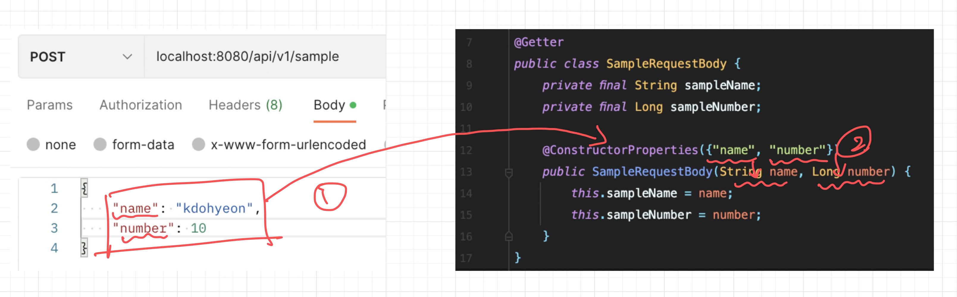 먼저, @ConstructorProperties 어노테이션을 별도로 생성한 생성자 위에 부여해준다. 그리고 외부에서 요청할 파라미터 이름을 속성으로 입력해준다. 아래 예시에서는 name 과 number 를 입력받아 sampleName, sampleNumber 에 각각 할당하려고 한다. 따라서 1) 에서는 name 과 number 로 값을 입력받고, 그대로 @ConstructorProperties 를 활용해 그 값을 전달받는다. 그리고 2) 에서는 그 순서에 맞춰 name 과 number 를 생성자로 주입한다.