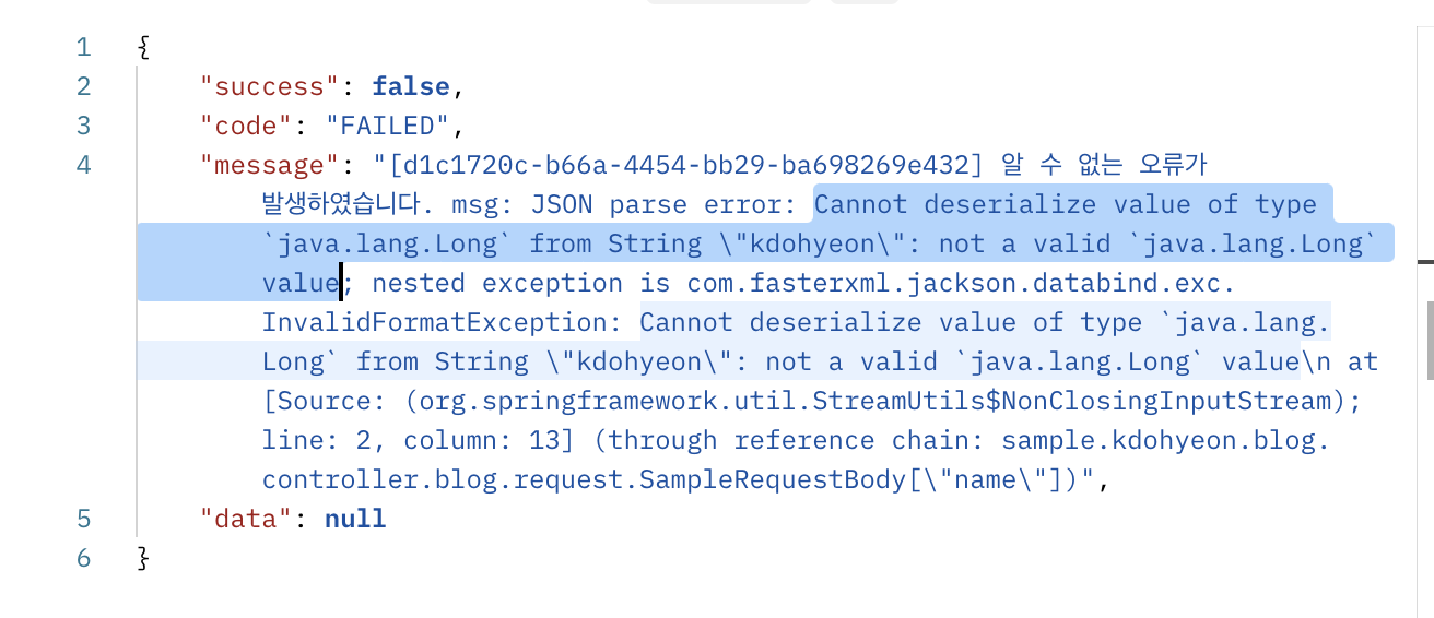 Type definition error: [simple type, class sample.kdohyeon.blog.controller.blog.request.SampleRequestBody]; nested exception is com.fasterxml.jackson.databind.exc.InvalidDefinitionException: Cannot construct instance of `sample.kdohyeon.blog.controller.blog.request.SampleRequestBody` (no Creators, like default constructor, exist): cannot deserialize from Object value (no delegate- or property-based Creator)\n at [Source: (org.springframework.util.StreamUtils$NonClosingInputStream); line: 2, column: 5]